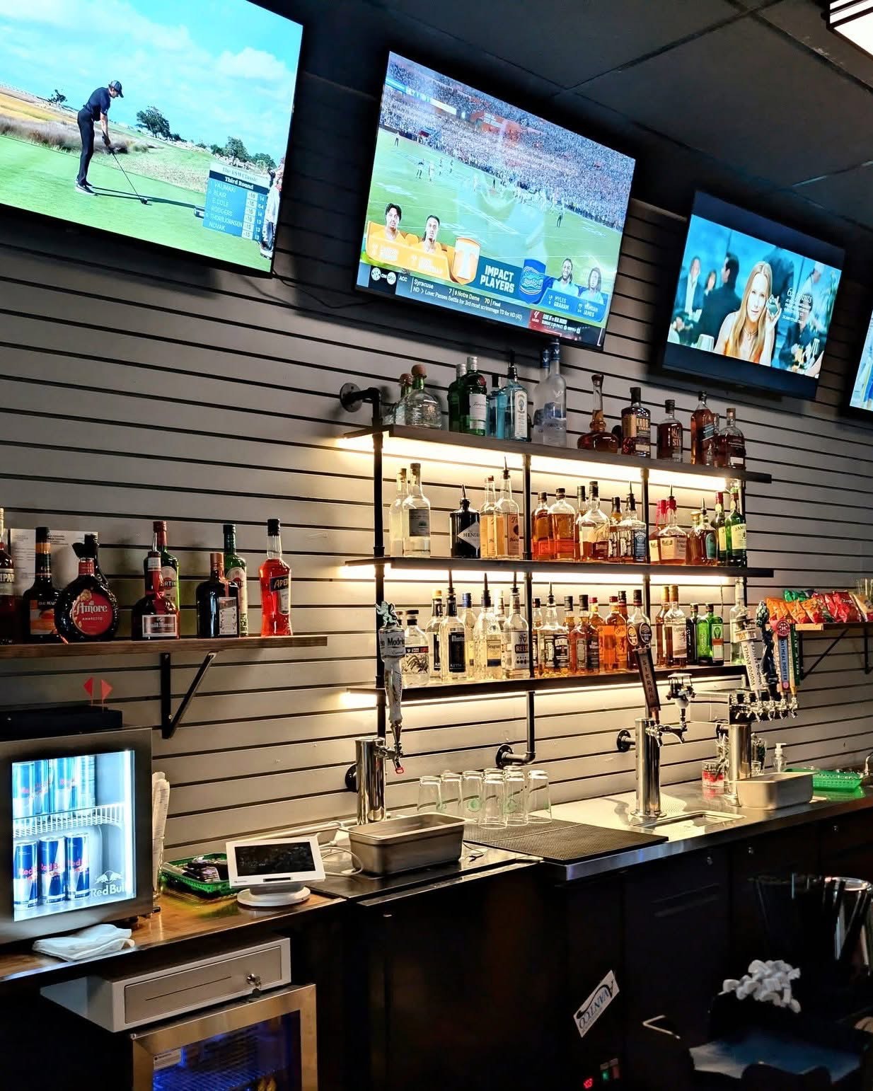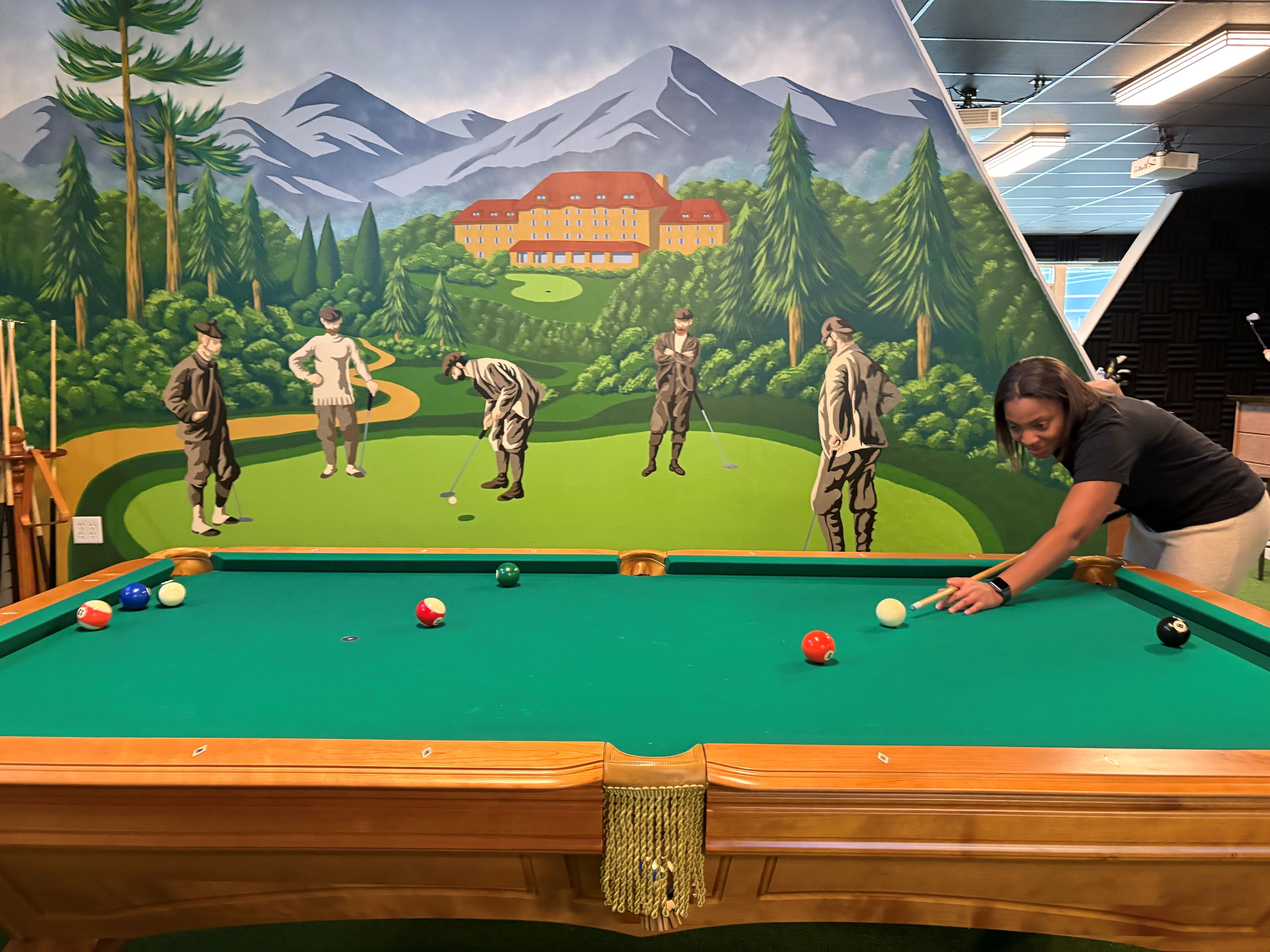 Happy Mix of Fun - golf simulators, pool table, and 8 TVs to watch football.